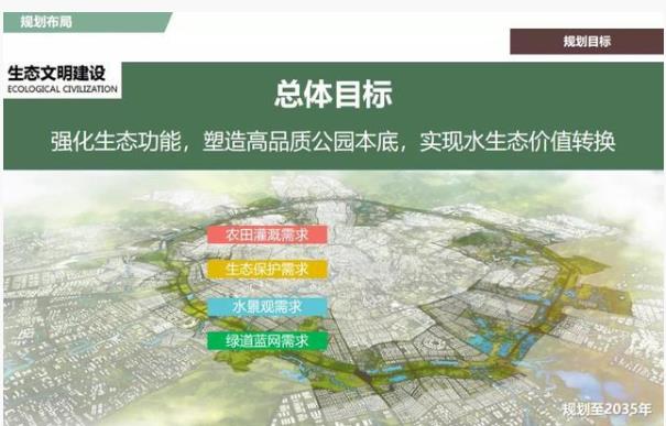 在統籌考慮生態文明建設中農田灌溉需求、生態保護需求、水景觀需求、綠道藍網需求的基礎上,《規劃》提出總體目標為強化生態功能,塑造高品質公園本底,實現水生態價值轉換,高品質呈現“綠道藍網、水城相融、清新明亮”的生態城市格局。