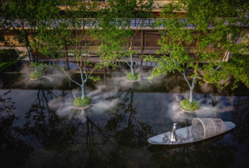 ???? 使環(huán)境富有個性與動感。有急緩、深淺之分;也有流量、流速、幅度大小之分,蜿蜒的小溪,淙淙的流水使環(huán)境更富有個性與動感。設(shè)計師以積沙為洲嶼,激水為波瀾,用綠洲與流水營造的溪澗隱喻珠江沿岸沖積平原的自然風(fēng)貌。濕地落霞,勃勃生機,感受自然的饋贈。站在原石之上,看流水緩緩沿著珠水輪廓注水入溪,看未見其景先聞水音百林以潤清之景。