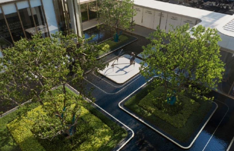 ??????? 姿態(tài)搖曳的烏桕,平靜如鏡的水面偶爾吹來一陣細(xì)軟的清風(fēng),每個人總需要這樣的幻彩凝香,回歸自然,為美好駐足留望;水面與陽光為伴,映射出五彩紛呈的理想世界……時而蕩漾的水面上流轉(zhuǎn)著華麗的色彩,設(shè)計師將它叫做“幻彩”;金屬質(zhì)感的流動線條,縈繞在水面以及水底,水面的線條構(gòu)建出幾座精致的綠色小島,它們被綠植簇?fù)恚瑢哟畏置鳎c綴著一棵棵形態(tài)優(yōu)美的叢生烏桕。水底的線條隨著“綠島”圍繞又延續(xù),讓水景不僅在色彩上幻彩多姿,在結(jié)構(gòu)與畫面感上也充滿著光怪陸離的視覺沖擊。