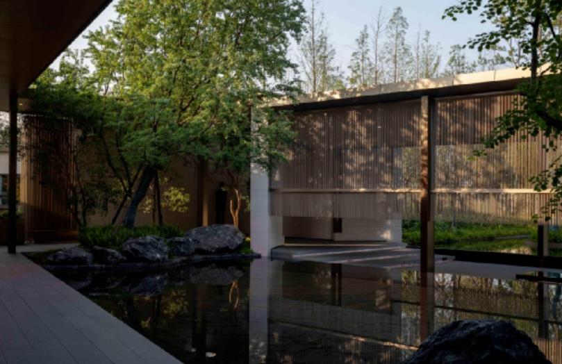 ????? 有良好的倒影效果,水面上的物體由于倒影的作用,給人以詩意、輕盈、浮游和幻想的視覺感受。風(fēng)和景明,波光沁碧。石之重疊立構(gòu),水之清澈靜美,木之溫潤拙樸,與風(fēng)、陽光相互呼應(yīng),傳遞自然的溫度。度假感的輕松氛圍在秩序與自然中悄然而生,形成寧靜超脫的場地力量。水,映射萬象,理性的線條形成空間的開合,融入留白意境,留下無限遐想。